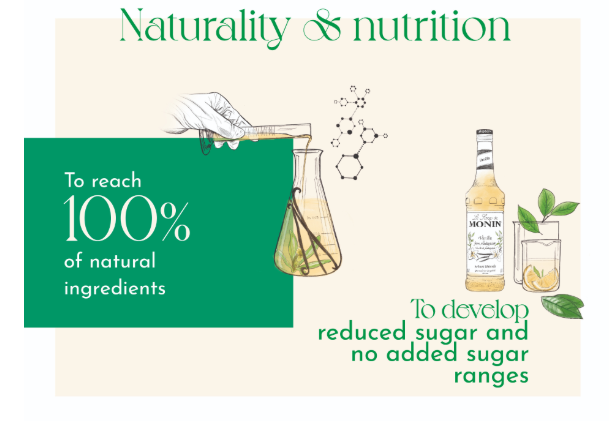 Monin huomioi kaikessa toiminnassaan vastuullisuuden, terveyden ja luonnon kunnioittamisen. Tuotteiden kaikki maut ja lähes kaikki väriaineet ovat luonnonmukaisia. Tuotteissa on johdonmukaisesti vähennetty sokeria. Veden kulutusta on pienennetty sekä energiaa tuotetaan aurinkopaneeleilla ja tuulivoimalla. Myös raaka-ainetoimittajat valitaan huolellisesti ekologisia periaatteita noudattaen.